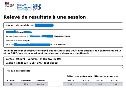 Mary (DELF A2- 99/100): ⭐⭐⭐⭐⭐